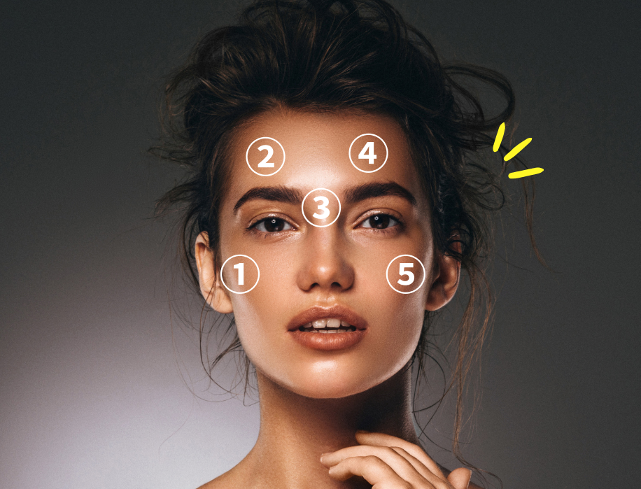 M字を描くように左頬・左額・鼻根・右額・右頬に各1プッシュ。